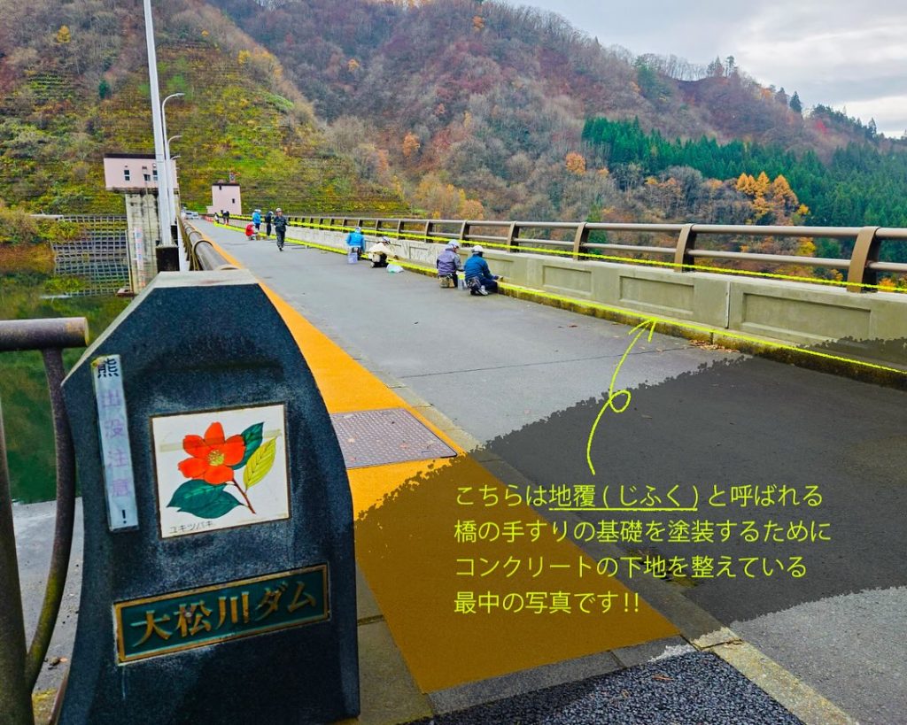 先日から大松川ダムの橋の手すりの基礎を塗装するために、下地調整を社員が行っておりましたので、それらの写真を共有します!